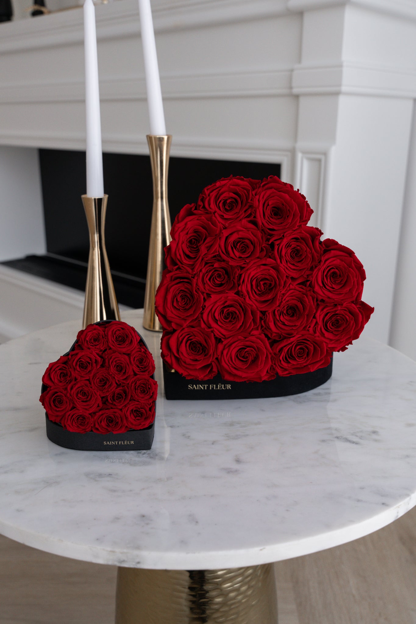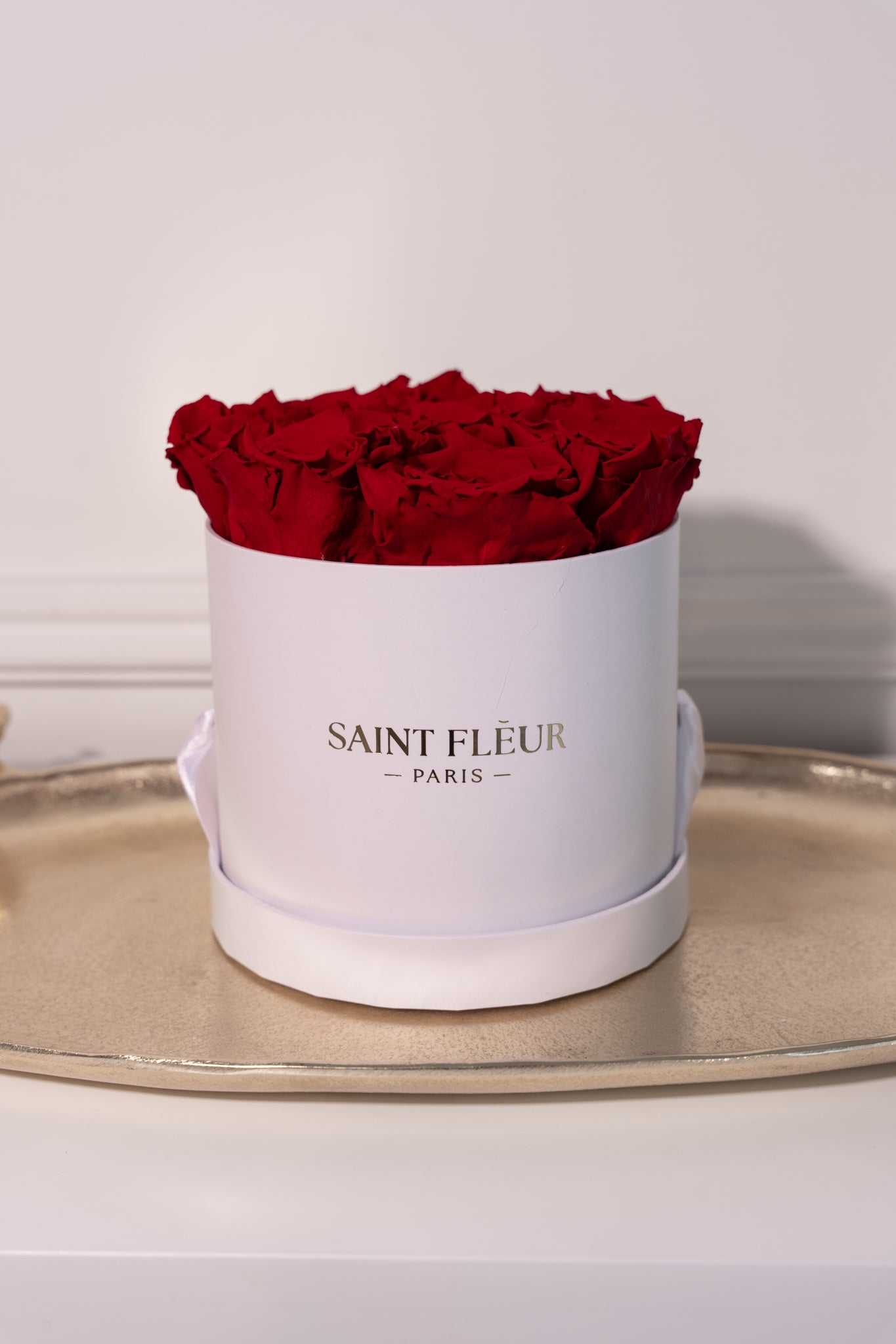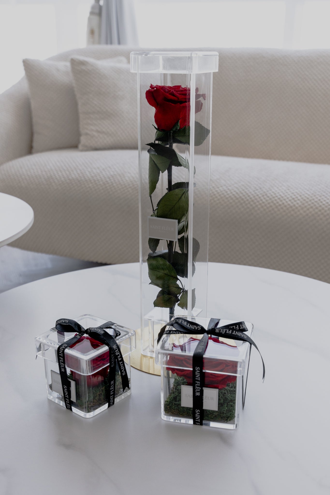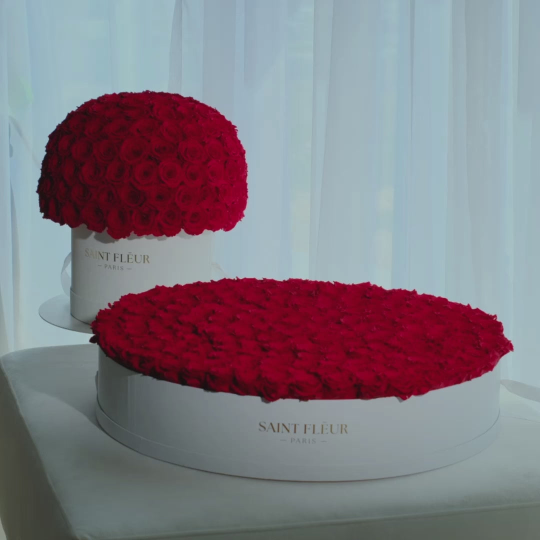 Caring for your flower arrangement is effortless: keep the roses in a stable, room-temperature environment and away from direct sunlight and extreme heat. Dust them lightly and handle the arrangement with care. Refrain from watering or placing the box in contact with light-colored fabrics to ensure the roses remain timeless.